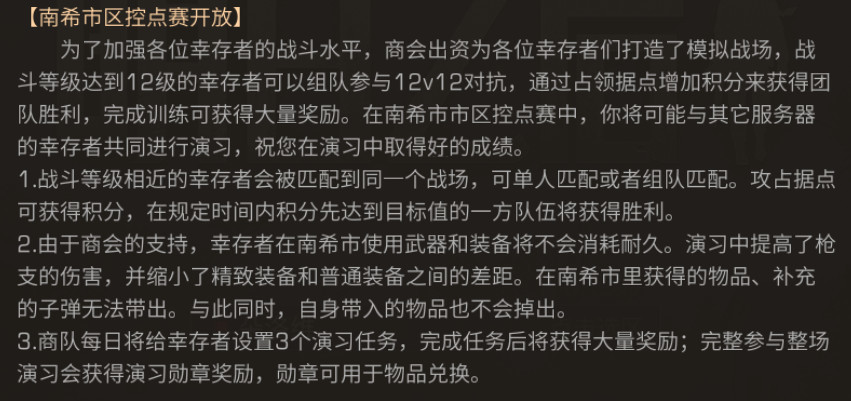 作为模拟战场玩法,这是类似于训练赛的形式。小伙伴们可以单人或者组队进行游戏匹配来完成这场12V12的模拟生存战斗。在这个玩法中,玩家使用武器和装备不会消耗耐久,小伙伴们可以放心大胆的游玩,同时也降低了精英装备和普通装备的伤害差距,但是在南希市里获得的物品等无法带出,自身携带进来的物品也不会掉落。
