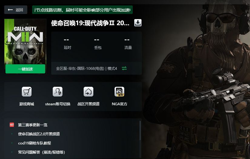 使命召唤19现代战争2已经上线半年左右的时间了,很多玩家反映游戏挺好玩的,就是有时候会出现闪退、掉线、打不开等问题。不少人想了解使命召唤19免费加速器哪个好?下面是关于cod19免费好用加速器推荐,有需要的玩家一起来看看吧。